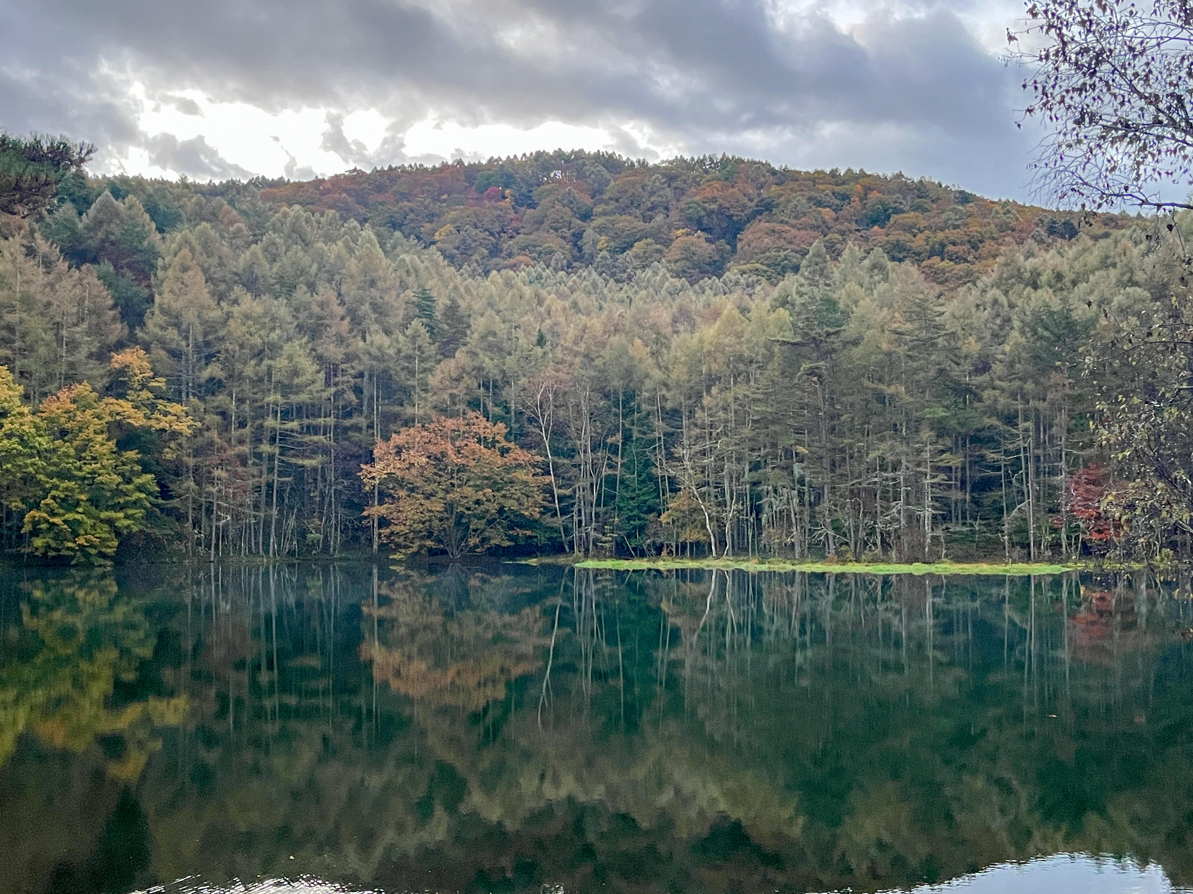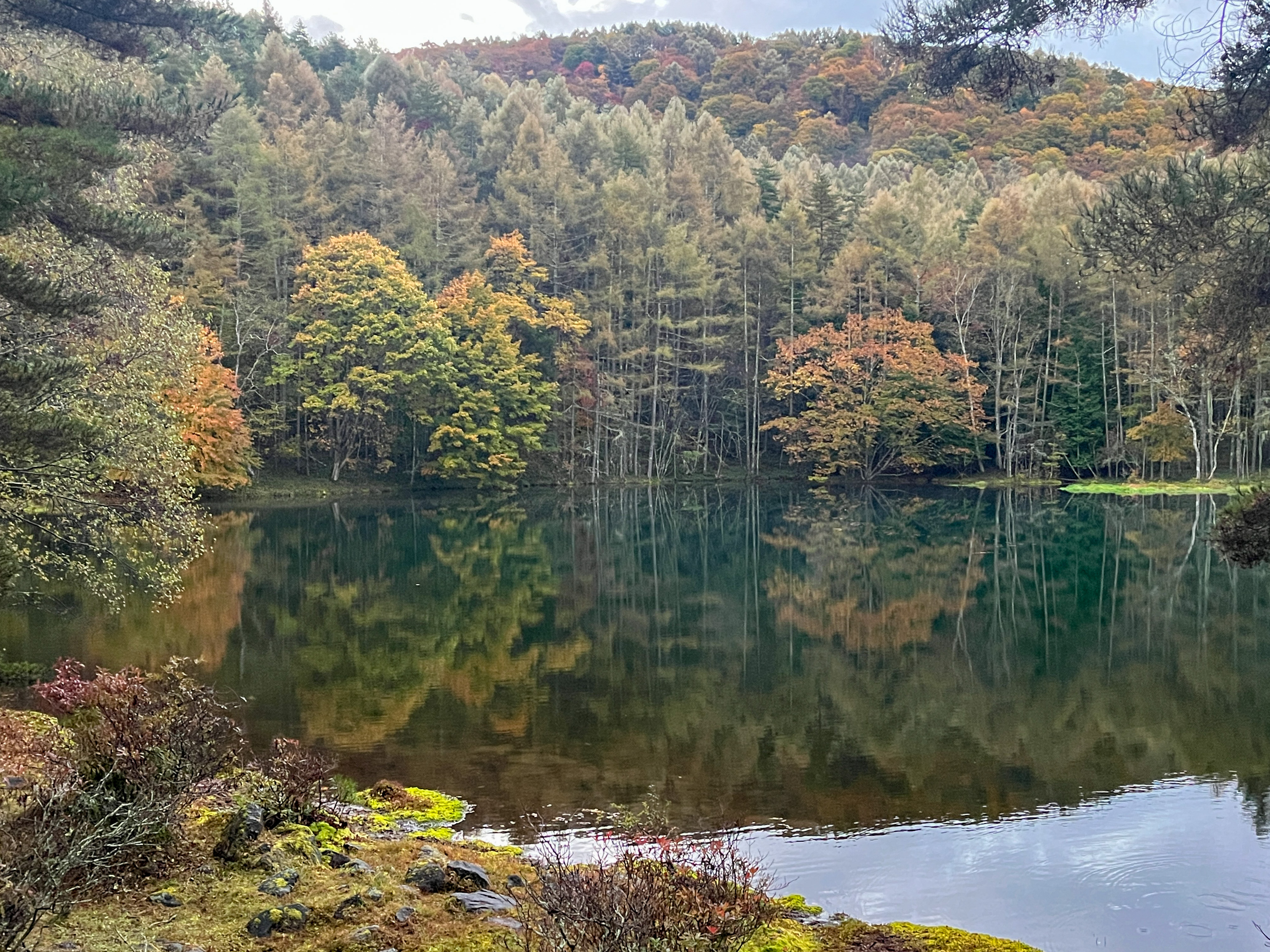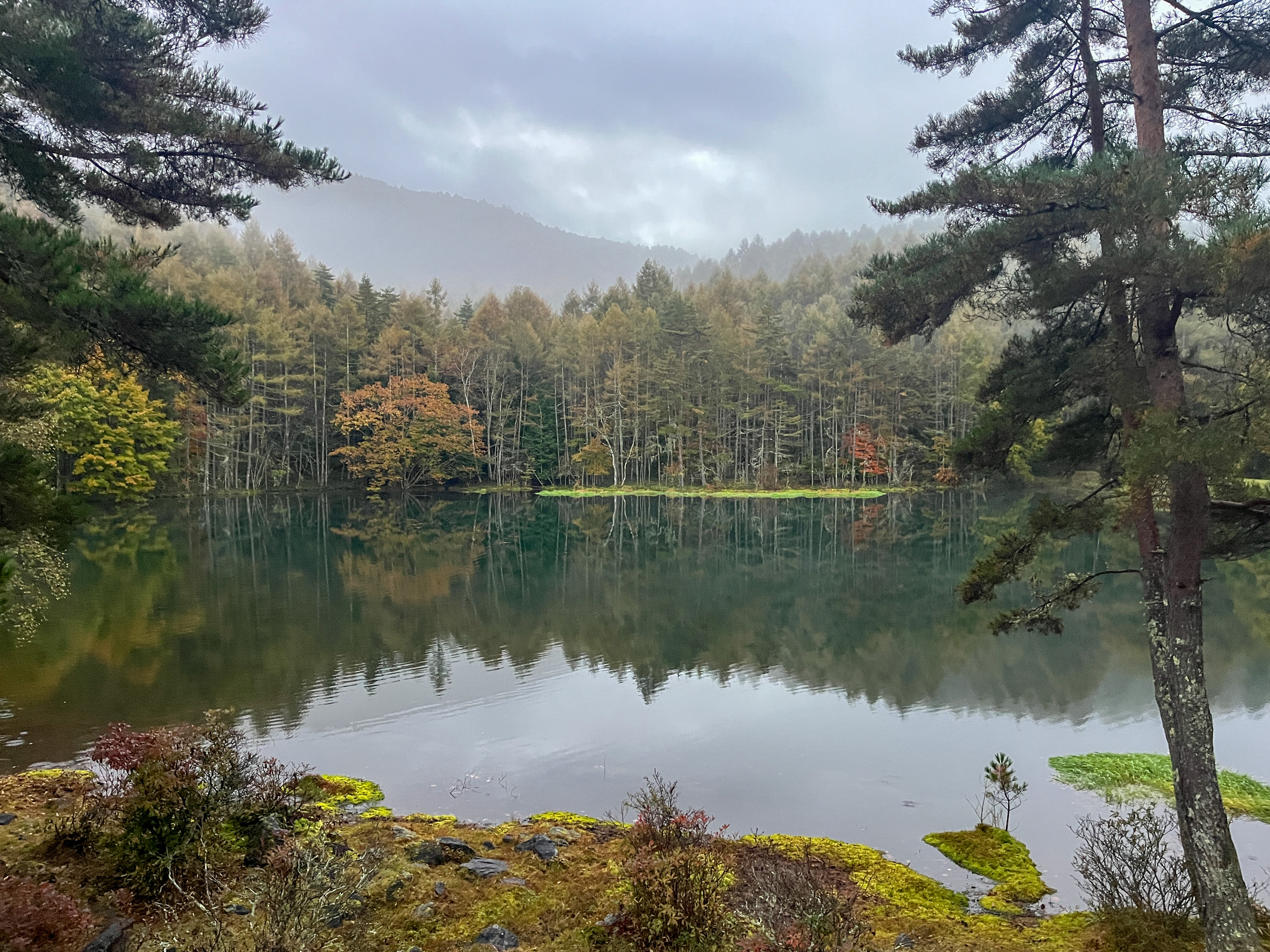 池畔のカラマツは5割程度の色づき。例年より1週間から10日ほど遅い感じです。