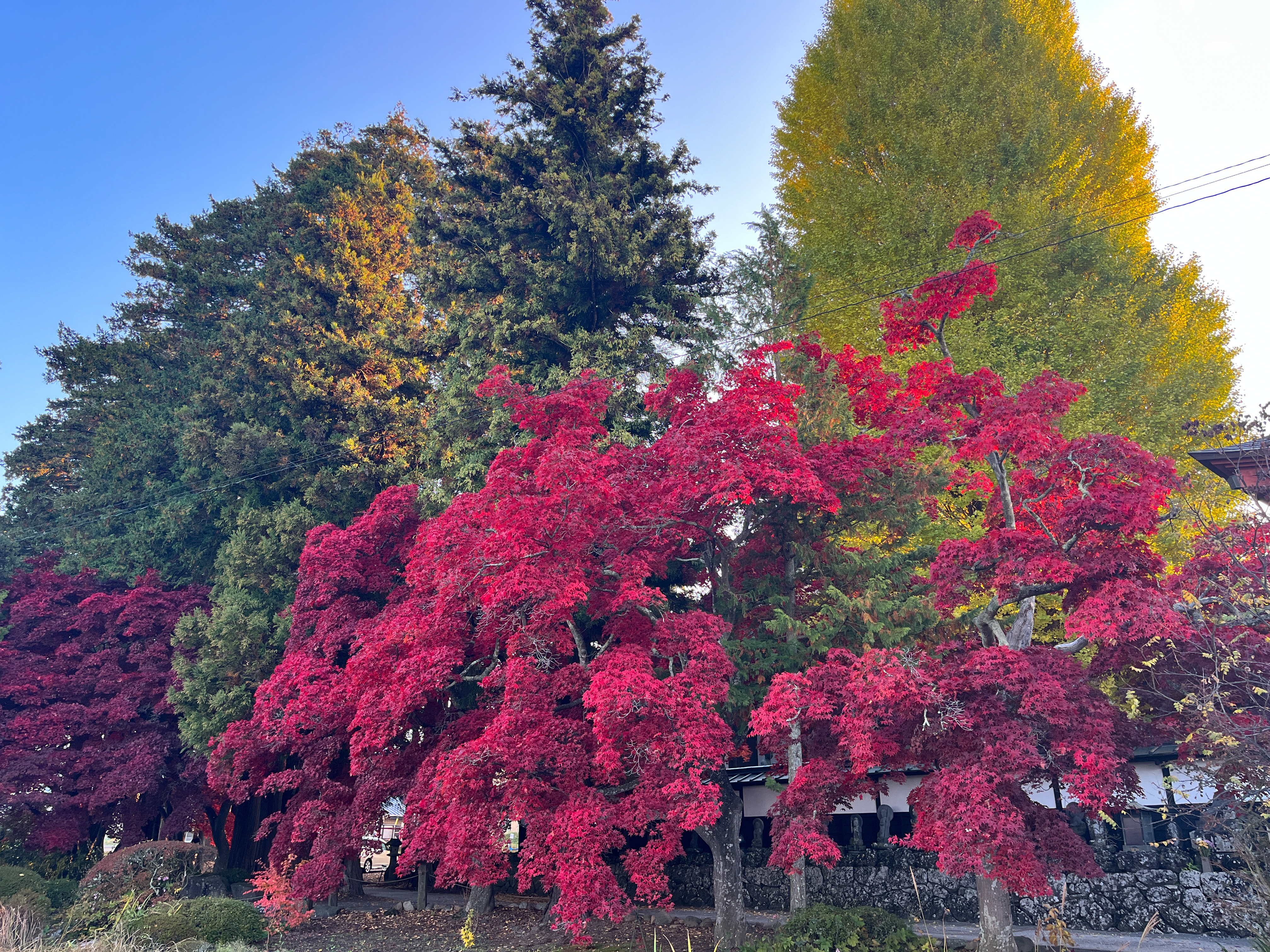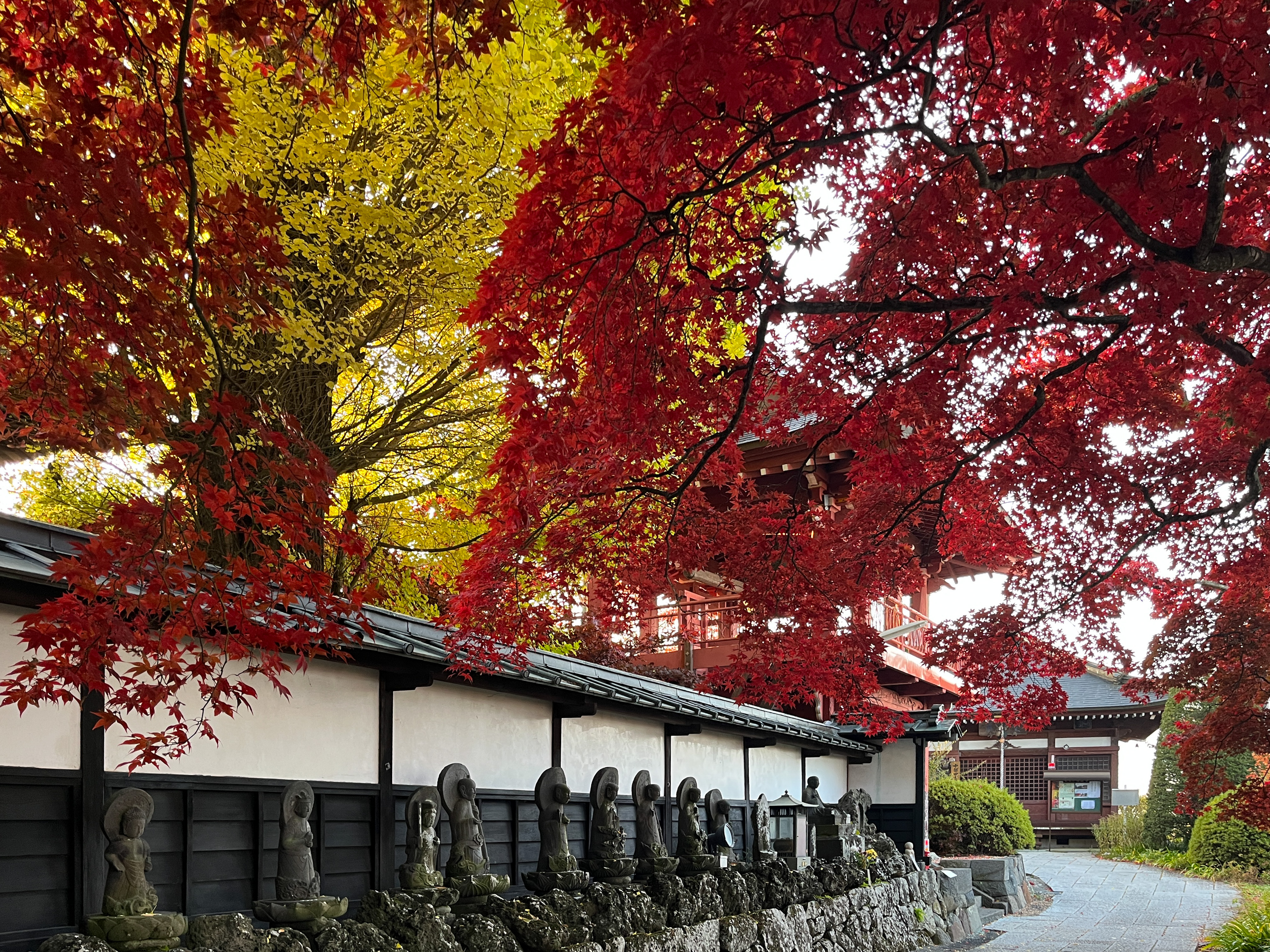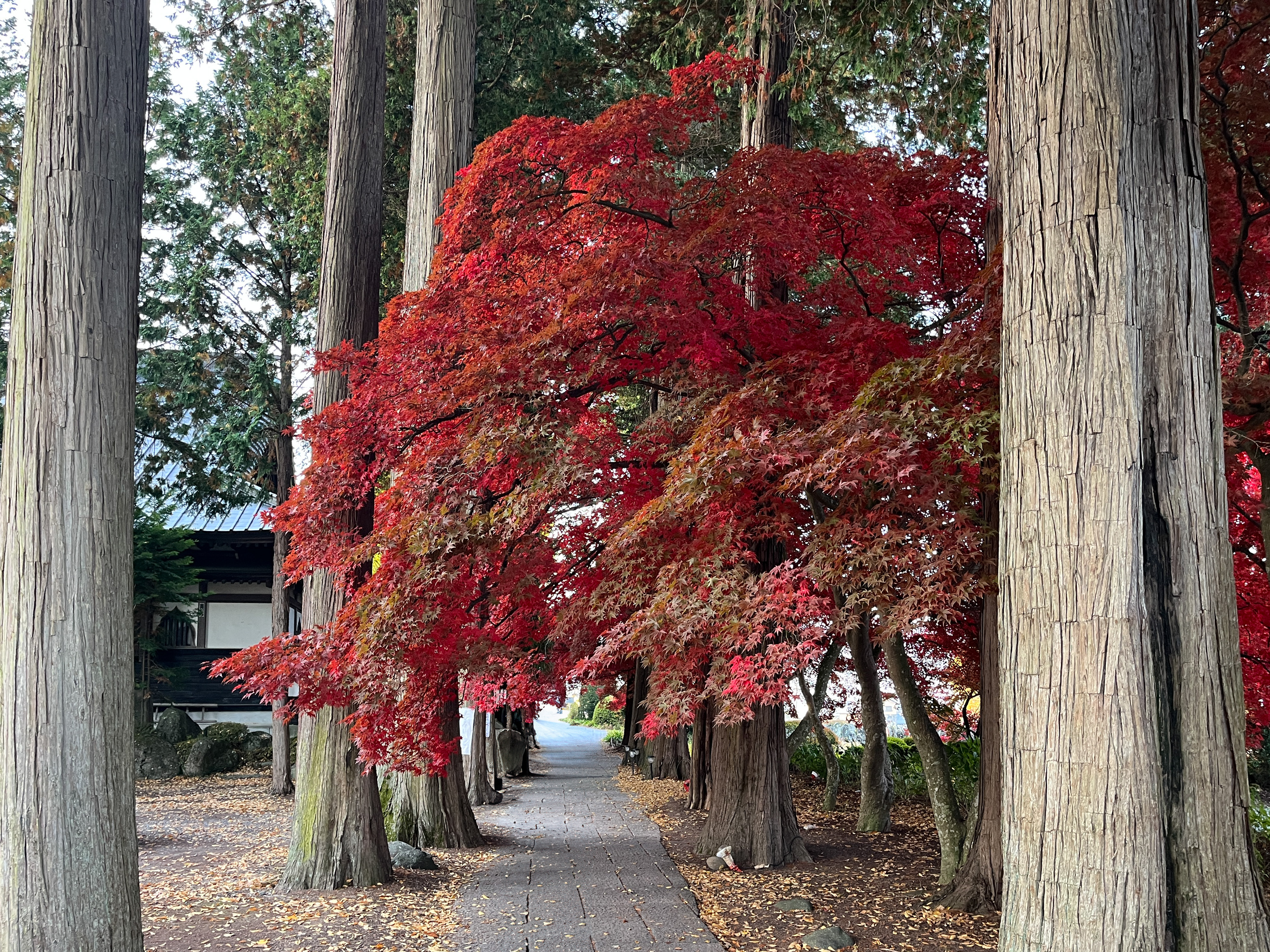 玉川の古刹、もみじ寺としても知られる長円寺の一行寺楓が深紅に染りました。もみじのトンネルもできました。