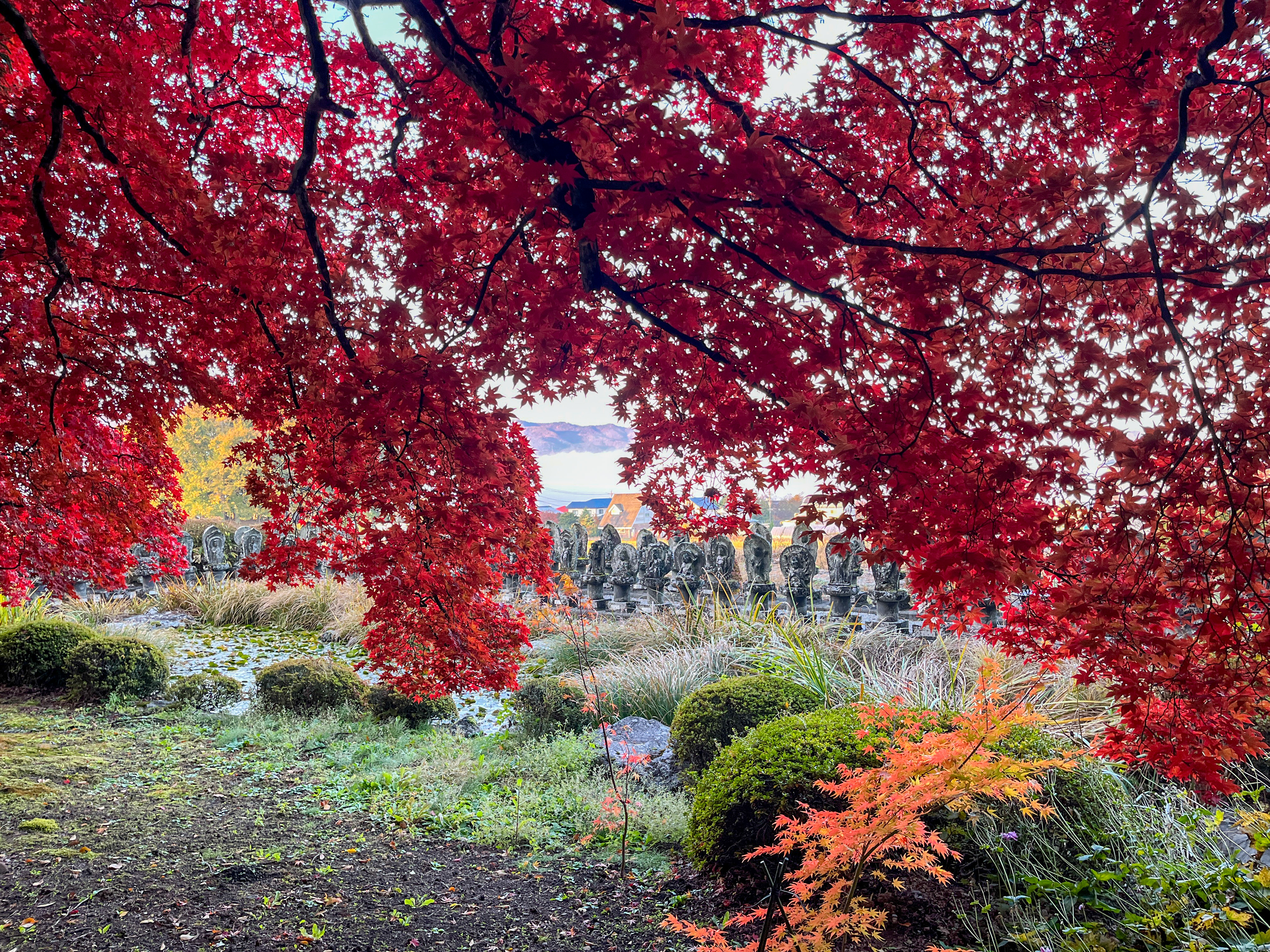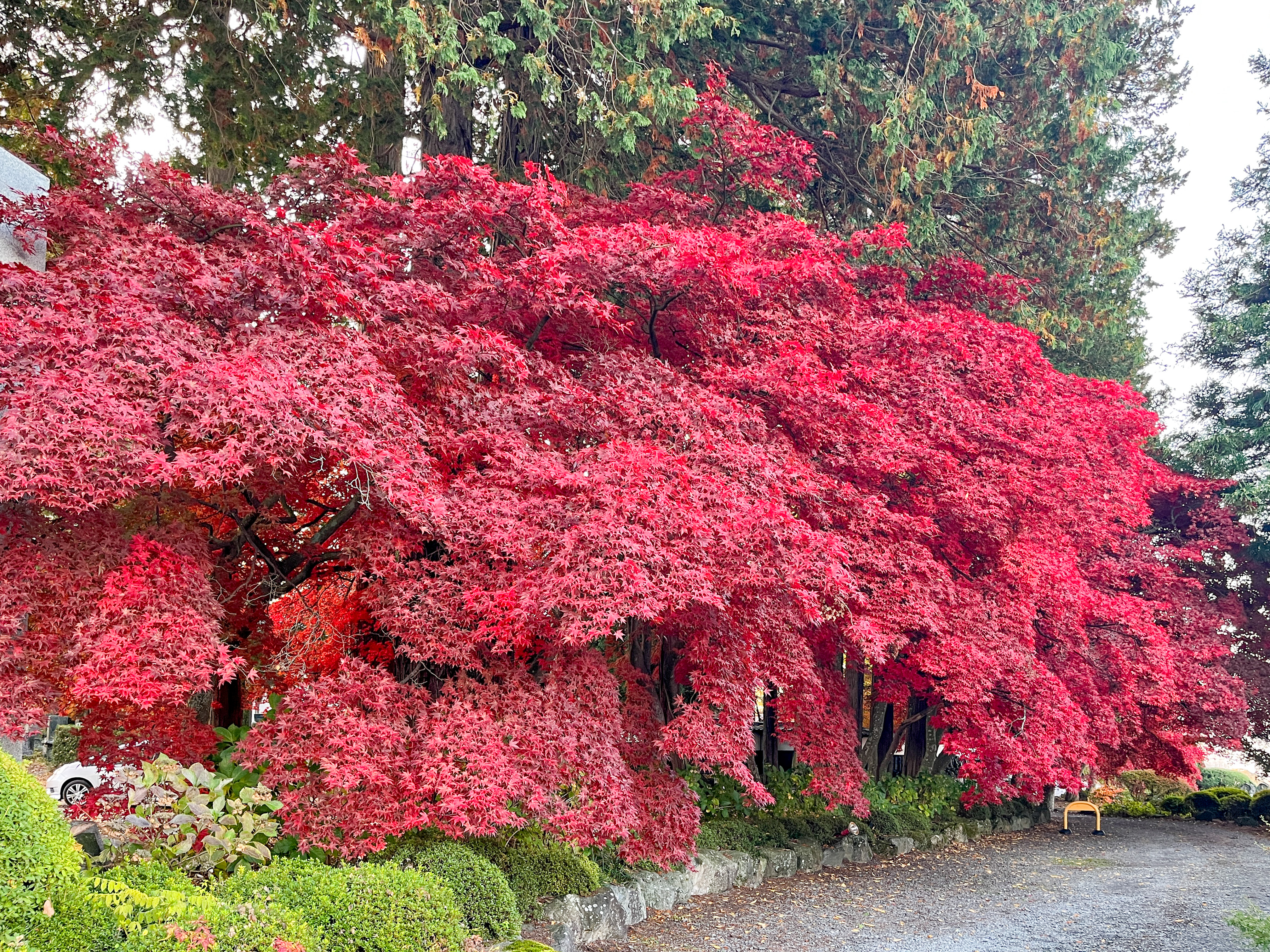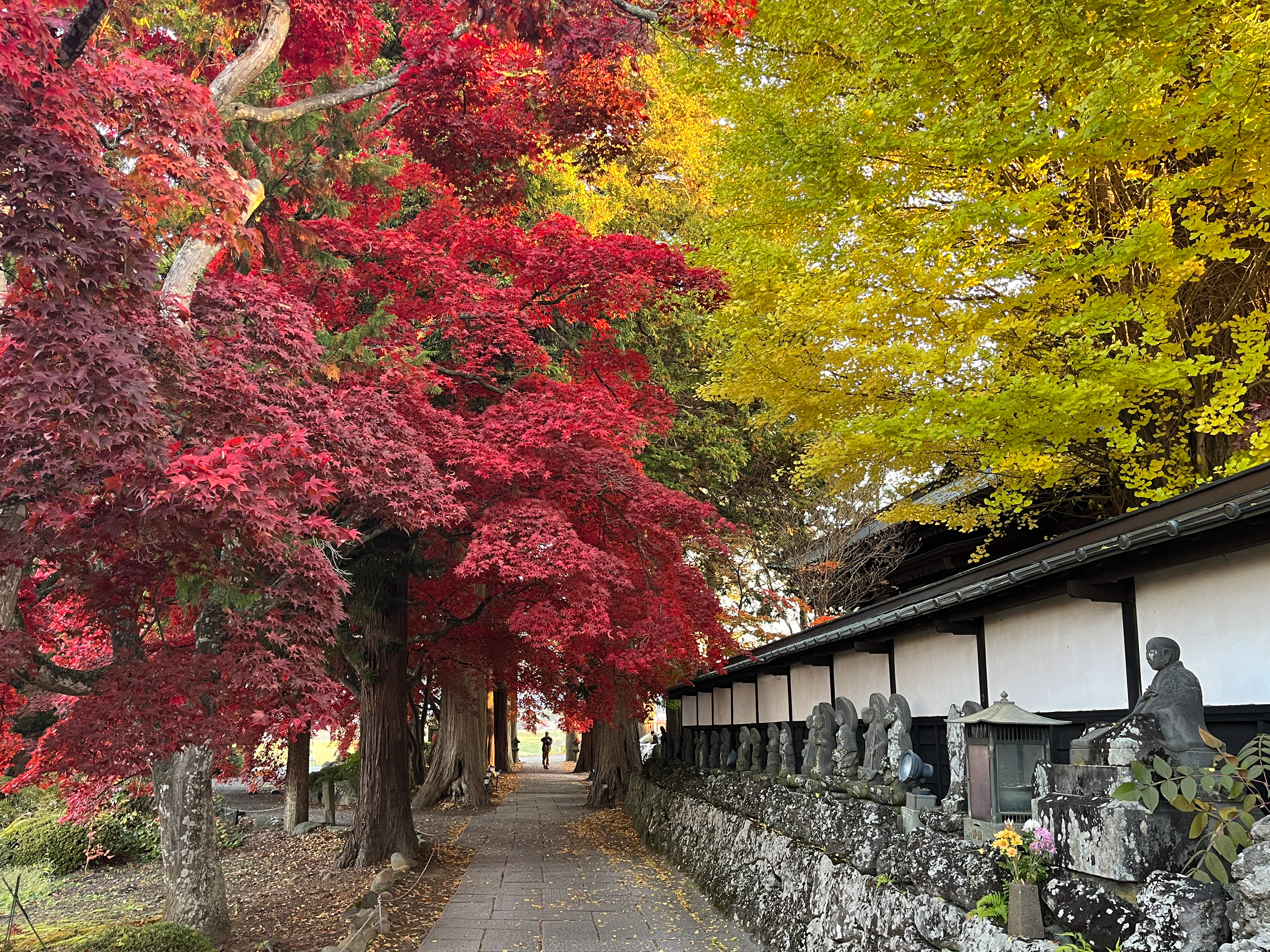玉川の古刹、もみじ寺としても知られる長円寺の一行寺楓が深紅に染りました。もみじのトンネルもできました。