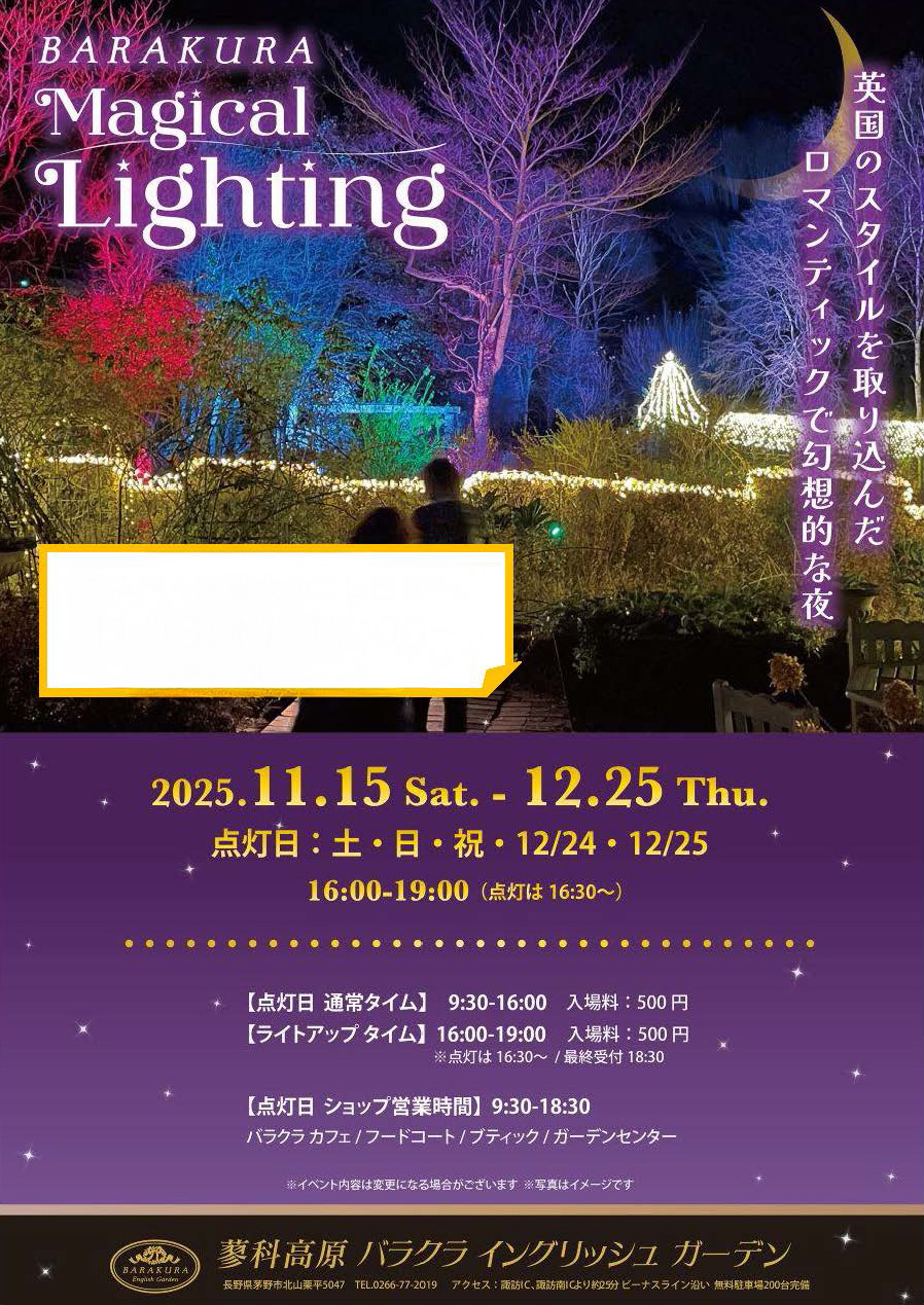 蓼科高原 バラクラ イングリッシュガーデンでは、昨年大変ご好評をいただいた、冬の蓼科の風物詩、クリスマスライトアップ【BARAKURA マジカル クリスマス】を本年も11月15日(土)~スタートいたします。