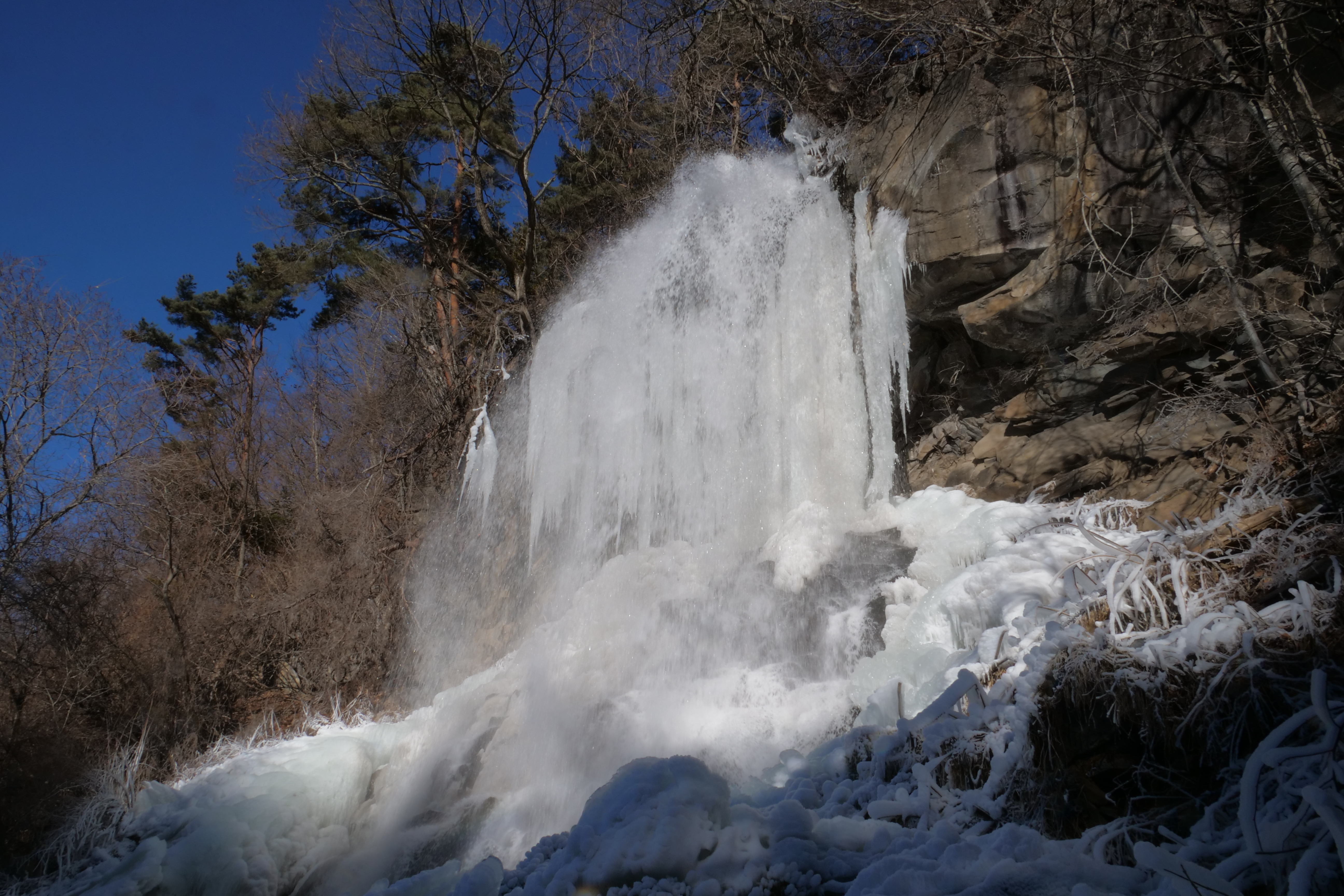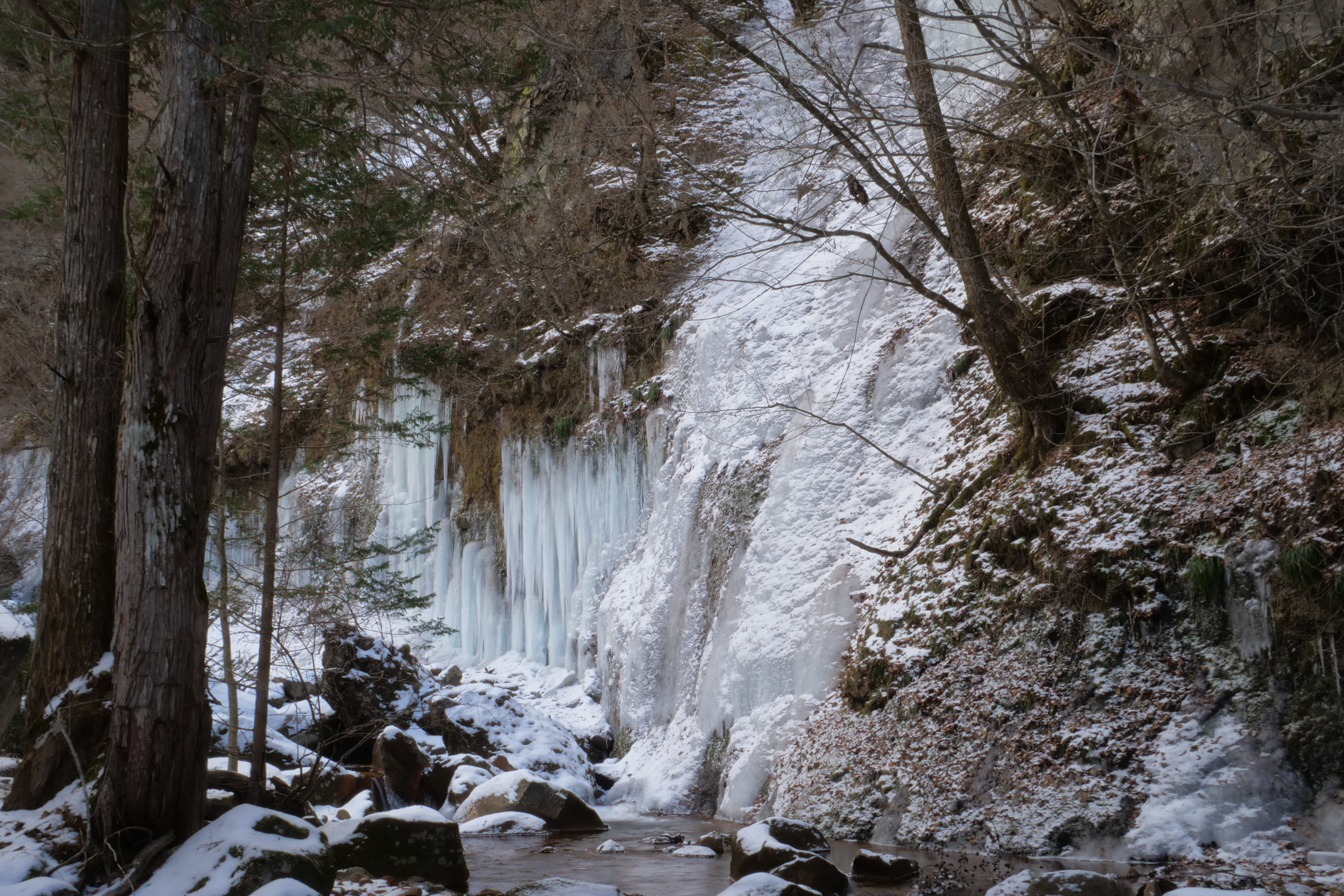 横谷峡の氷瀑(2026.1.26) 蓼科 蓼科中央高原 連日の冷え込みで、横谷峡屏風岩の氷瀑群が大きくなってきました 乙女滝も徐々に凍ってきています 遊歩道は凍結しています。チェーンスパイク等の防滑装備、暖かい服装でお越しください