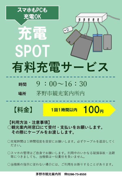 茅野市観光案内所でスマホの有料充電サービス開始 茅野市観光案内所ではスマホの有料充電サービスを開始しました。 料金:1回100円(1時間以内) 利用可能時間:9:00~16:30 観光案内所窓口にて受付・支払いをお願いします。その際に充電ケーブルをお渡しします。